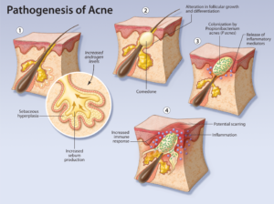 Često se javljaju akne (lat. acnae vulgares), najčešće po koži lica, vrata i prsa. Njihov rast potiče povišena razina muških spolnih hormona koji djeluju na korijen dlake tako da stimuliraju izlučivanje loja. Povećana količina loja u kanalu dlake može dovesti do začepljenja kanalića i nastanka komedona. Kada dođe do infekcije ovako podraženog područja javlja se upalna reakcija i razvija akna. Akne su prisutne na licu, vratu, prsištu i gornjem dijelu leđa.